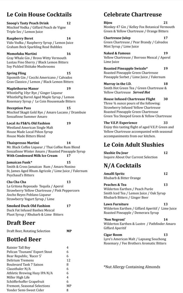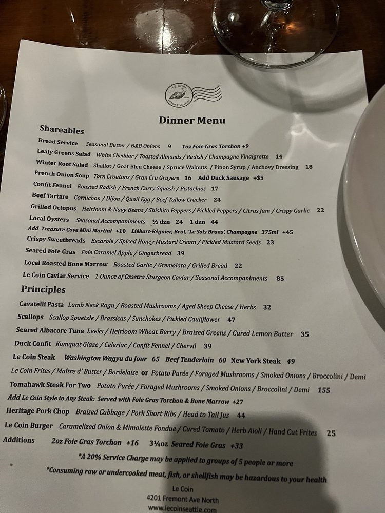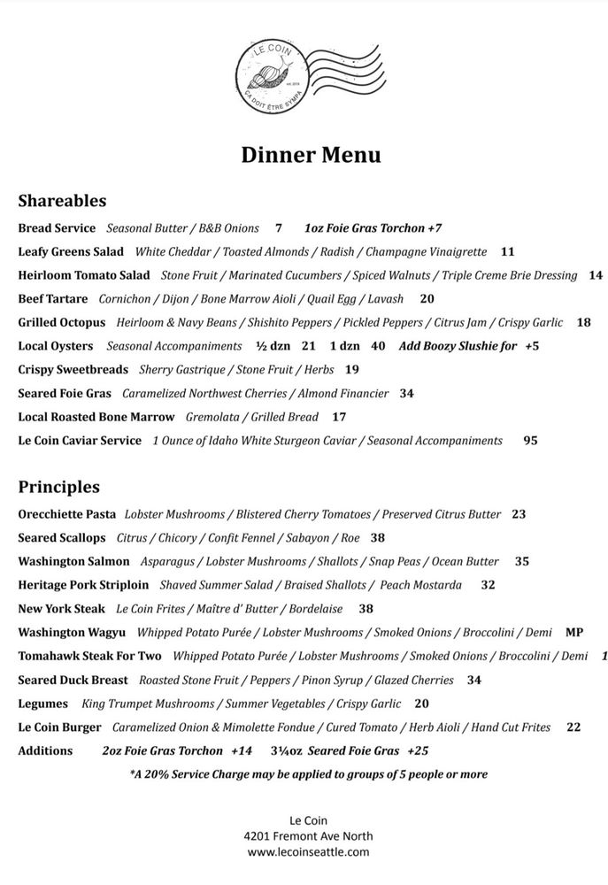 Le Coin is a trendy, classy French-New American seafood restaurant located in Seattle. Offering a diverse menu with vegan and limited vegetarian options, Le Coin is known for its upscale ambiance and excellent service. Customers have raved about the halibut dish, which is perfectly cooked and paired with a delicious aioli. The wine selection is impressive, with 50% off bottles on Wednesdays and knowledgeable sommeliers to assist with pairings. The cozy decor and friendly staff add to the overall dining experience, making it a popular choice for special occasions. While some reviews mention service inconsistencies, the delicious food and chic atmosphere make Le Coin a standout restaurant worth visiting.